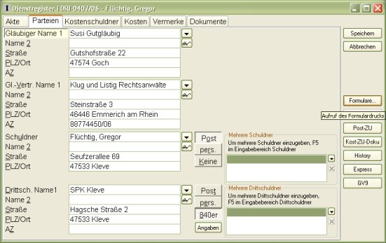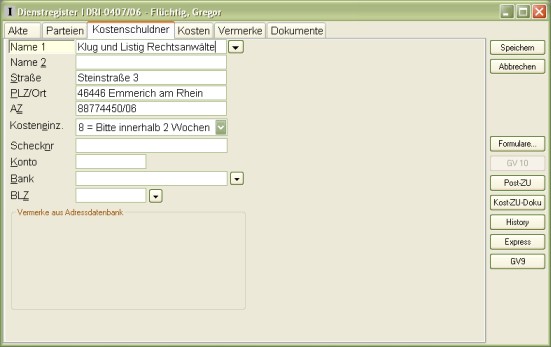 Die zweite Seite verzeichnet die Namen und Adressen der beteiligten Parteien, sowie deren Vertreter. Die dritte Seite enthält den Kostenschuldner inklusive seiner Bankverbindung. Auf der vierten Seite des DR I geben Sie das Erledigunsdatum, die Statistik und die Kostenrechnung ein. Auf der fünften Seite können Sie einige zusätzliche Vermerke machen.