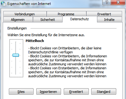 Lösung: Stellen Sie in den Internetoptionen (Start / Systemsteuerung / Internetoptionen) auf der Registerkarte Datenschutz den Schutz auf mindestens „Mittelhoch“, keinesfalls höher!