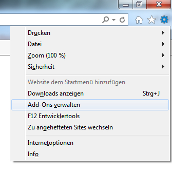 Lösung: Starten Sie den Internetexplorer. Klicken Sie oben rechts auf das Zahnrad und dann auf „Add-Ons verwalten“: