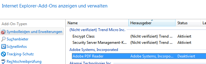 Deaktivieren Sie z.B. den „Adobe Reader“ mit einem Klick auf den Eintrag in der Liste und danach unten rechts auf „Deaktivieren“: