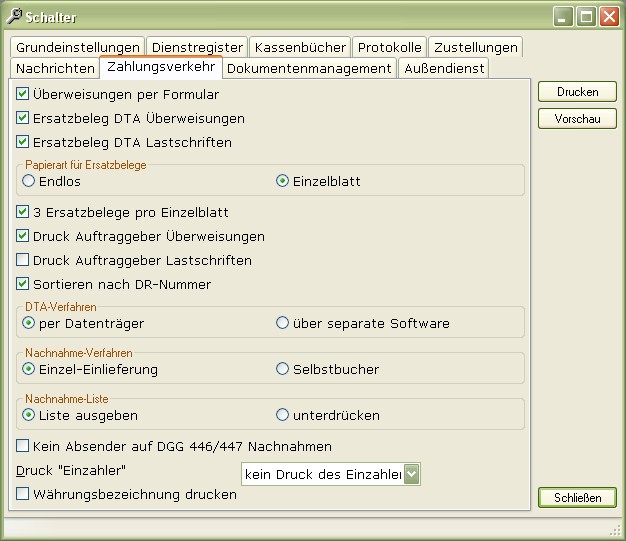 aktivieren Sie den Schalter für die Ersatzbelege (vorgeschrieben z.B. in Bayern und Niedersachsen)Seit der Version 1.18.800 können Überweisungen auch per Überweisungsvordruck durchgeführt werden. Dazu muss lediglich der erste Schalter Überweisungen per Formular mit einem Häkchen versehen sein. Sämtliche anderen Einstellungen für die Ausgabe von Überweisungen werden dann ignoriert. Die Ausgabe von Überweisungen per Formular wird von einem separaten Assistenten erledigt.
