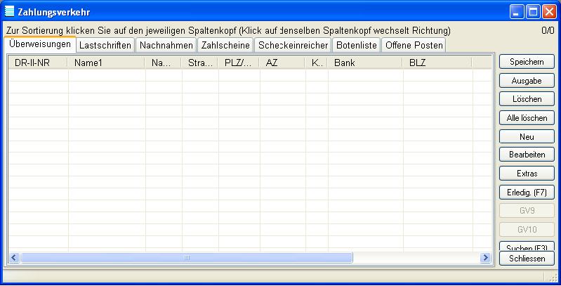 . Es wird folgendes Fenster angezeigt:Wie Sie sehen, werden verschiedene Karteireiter angeboten, voreingestellt ist der Karteireiter für die Überweisungen. Klicken Sie mit der Maus auf den gewünschten Karteireiter, alternativ können Sie auch mit der Tastatur wechseln. Benutzen Sie hierzu die Alt-Taste in Kombination mit dem jeweils unterstrichenen Buchstaben (Beispiel: Alt + L um zu Lastschriften zu wechseln).