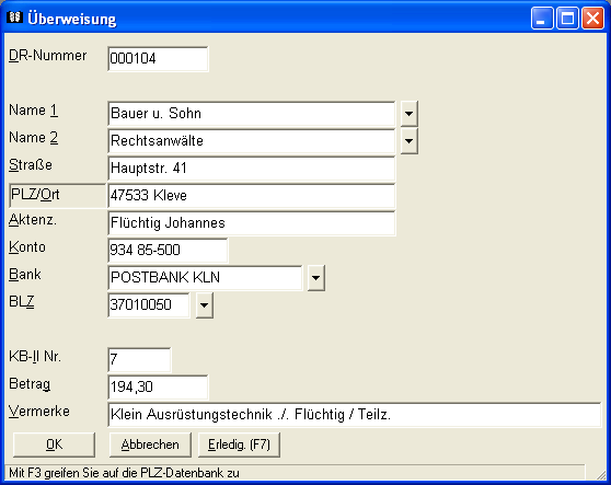 Die Eingaben werden vor dem Speichern auf Ihre Gültigkeit überprüft, so dass z.B. fehlende Kontonummern oder fehlende bzw. fehlerhafte Bankleitzahlen und Beträge ausgeschlossen sein sollten.