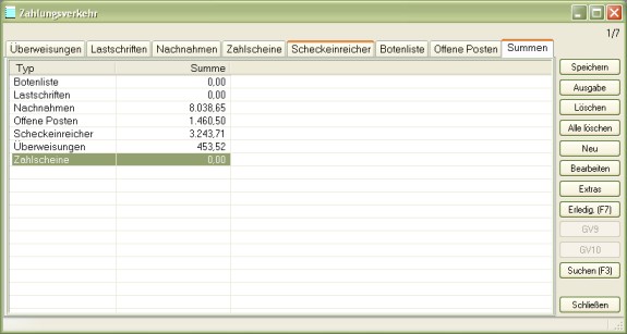 Die Anzeige für Lastschriften, Nachnahmen, Zahlscheine, Scheckeinreicher und Botenlisten unterscheiden sich ein wenig von der für Überweisungen und Offene Posten:
