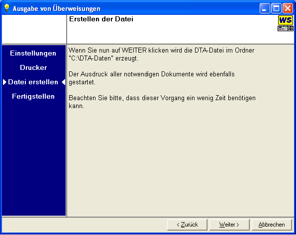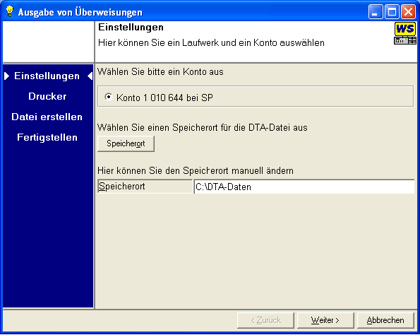 Die Erstellung von DTA-Datenträgern erfolgt entweder in 5 kurzen Schritten (wenn ein Datenträger erzeugt werden soll) oder aber in 4 Schritten, wenn die Ausgabedatei in einem beliebigen Speicherort zur weiteren Verwendung erzeugt wird. In diesem Beispiel wird die Ausgabedatei im Ordner C:\Temp erzeugt, der Assistent enthält nur 4 Schritte: