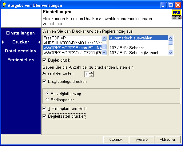 Sie können die Anzahl der zu druckenden Überweisungslisten wählen, außerdem können Sie festlegen, ob Ersatzbelege gedruckt werden und wenn ja, auf welchem Papier und ob 3 Exemplare pro Seite gedruckt werden sollen. Selbstverständlich werden die bereits oben erwähnten Schalter ausgewertet, Änderungen an diesen Schaltern werden gespeichert und stehen bei der nächsten Verwendung des Assistenten wieder zur Verfügung.