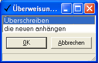 Nun sind bereits alle notwendigen Angaben vorhanden, klicken Sie bitte auf F10) um die Datei zu erstellen. Der Speicherort wird nun auf Gültigkeit überprüft, sollte sich bereits eine DTA-Datei auf diesem befinden, werden Sie aufgefordert zu entscheiden, was mit der vorhandenen Datei geschehen soll (Überschreiben, Anhängen...):