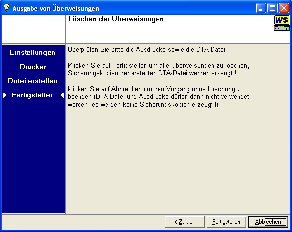 Überprüfen Sie nun bitte die erzeugten Ausdrucke und stellen Sie sicher, dass die erzeugte Ausgabedatei lesbar ist. Ist dies der Fall, können die gespeicherten Datensätze nun gelöscht werden, damit keine Doppelüberweisungen und -lastschriften erzeugt werden können. Dazu klicken Sie bitte auf F10).