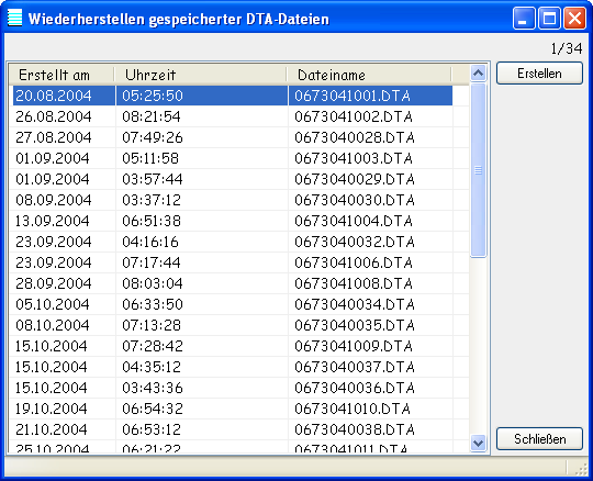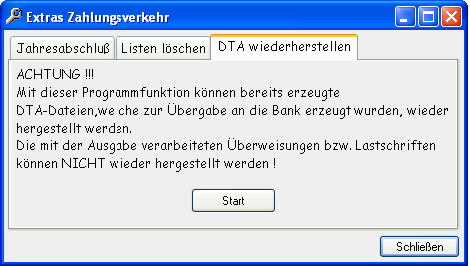 Bitte beachten Sie, dass diese Funktion nur gespeicherte DTA-Dateien wieder für die Bereitstellung für Ihre Bank wiederherstellt ! Es ist hiermit nicht möglich, Überweisungs- oder Lastschriftenlisten für den Zahlungsverkehr wieder herzustellen !!!