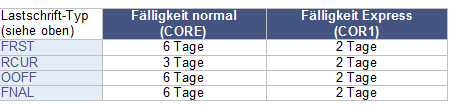 Gemäß den Regelwerken für die SEPA-Basis-Lastschrift müssen erstmalige Lastschriften fünf Tage vor Fälligkeit bei der Zahlstelle vorliegen, darauf folgende Zahlungen hingegen mindestens zwei Tage vor Fälligkeit. Die Vorlauffrist für einmalige Lastschriften beträgt ebenfalls fünf Tage. Viele Geldinstitute haben diese Fälligkeit jeweils um einen Tag erweitert. Diese haben wir entsprechend berücksichtigt: Für Lastschriften gilt: Es gibt 4 Arten von Lastschriften: Erstlastschriften (Typ = FRST), wiederkehrende Lastschriften (Typ = RCUR), einmalige Lastschriften (Typ = OOFF) und letztmalige Lastschriften (Typ = FNAL). Alle Lastschriften haben Vorlauffristen (Fälligkeiten), der Einzug bzw. die Gutschrift erfolgt nicht sofort, sondern erst nach Ablauf der Vorlauffrist. Diese Fristen sind weiter unten aufgelistet.