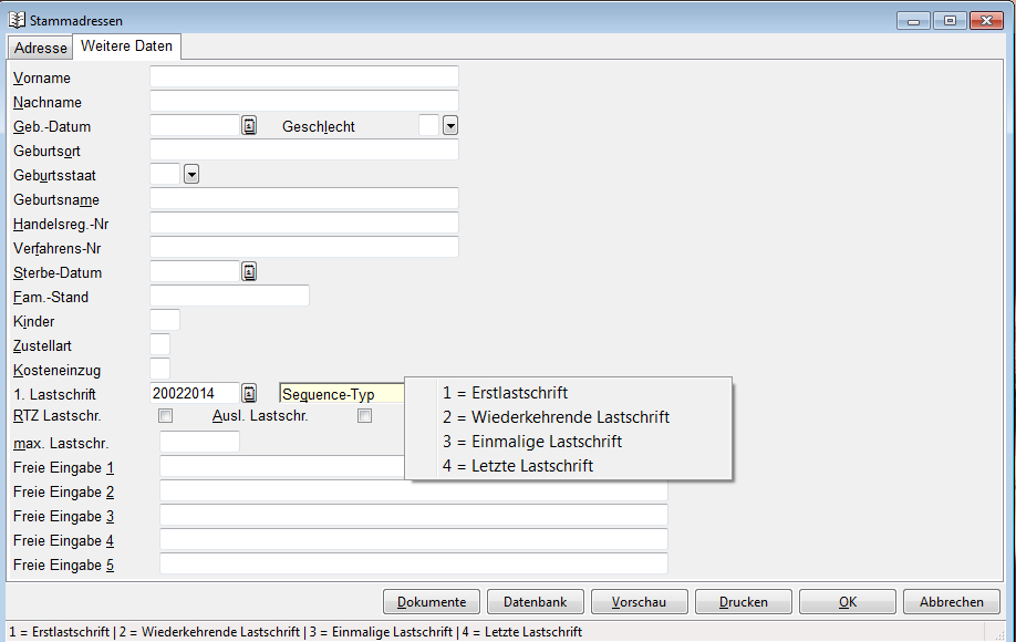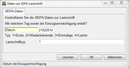 Der Ablauf erfolgt automatisch, lediglich bei manuell erfassten Lastschriften muss hier ein Typ vom Anwender angegeben werden. Fehlt der Typ einer Lastschrift wird er bei der Ausgabe automatisch auf "FRST" gestellt.