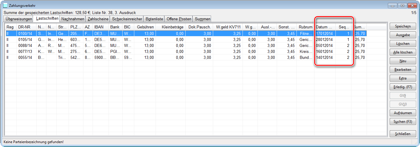 Im Zahlungsverkehr wurde die Maske um zwei Felder erweitert, anhand derer Sie erkennen können, um welchen Typ es sich handelt (Feld „Sequence-Typ“).