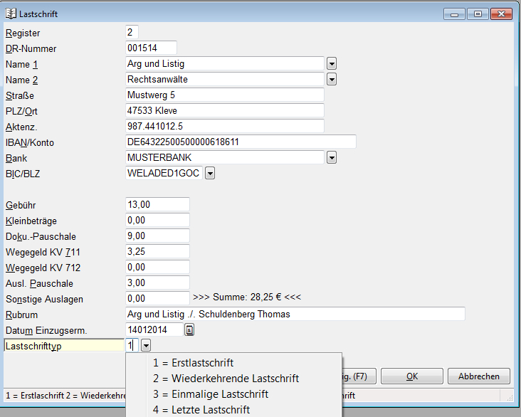 Jede einzelne im GV Büro System erfasste Lastschrift enthält nun ein Merkmal, welches den Typ der Lastschrift beschreibt (1 = FRST, 2 = RCUR, 3 = OOFF, 4 = FNAL). Wenn eine Lastschrift durch den Druck einer Nachricht erzeugt wird, ermittelt das GV Büro-System aus einem evtl. vorhandenen Datensatz des Kostenschuldners in der Adressdatenbank den dort gespeicherten Lastschriftentyp und verwendet diesen bzw. stellt diesen von FRST auf RCUR um.