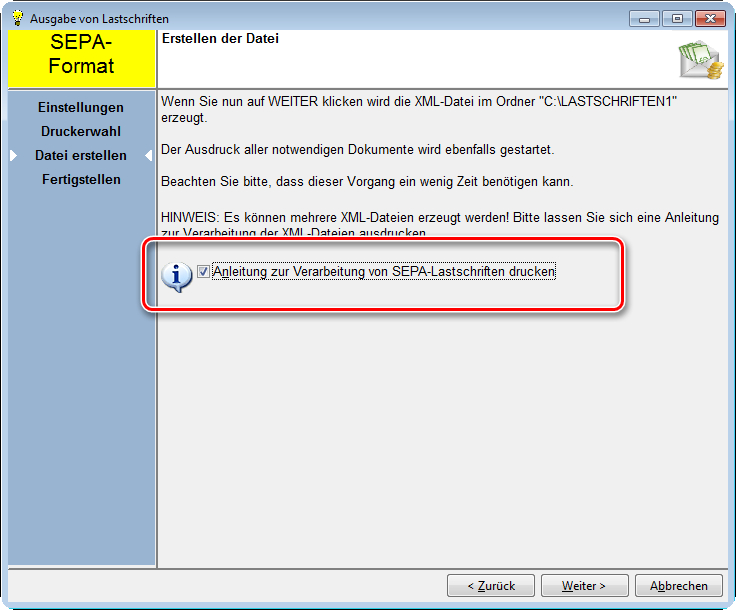 Außerdem sollten Sie sich mindestens einmal eine Anleitung zur Ausgabe und Verarbeitung der SEPA-Dateien drucken lassen, dafür gibt es im Assistenten die Checkbox "Anleitung zur Verarbeitung von SEPA-Lastschriften drucken".