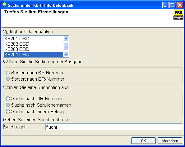 Wenn Sie nach einem Schuldnernamen suchen möchten, wählen Sie die entsprechende Option aus. Im Feld Suchbegriff geben Sie bitte den gewünschten Namen oder auch nur einen Teil des Namens ein. Wenn als Suchbegriff die Zeichenfolge flücht eingegeben wurde, würde der Assistent alle Einträge finden, in welchen im Namen des Schuldners dieser Suchbegriff vorkommt, z.B. Gregor Flüchtig oder Verflüchtigungsgesellschaft. Die Groß- oder Kleinschreibung spielt bei der Suche keine Rolle.