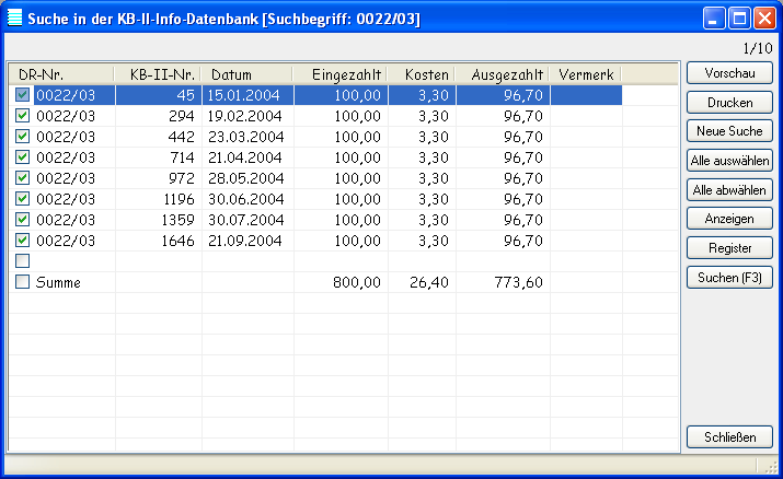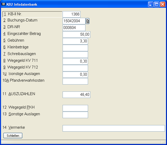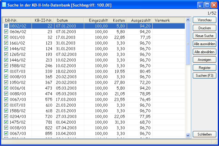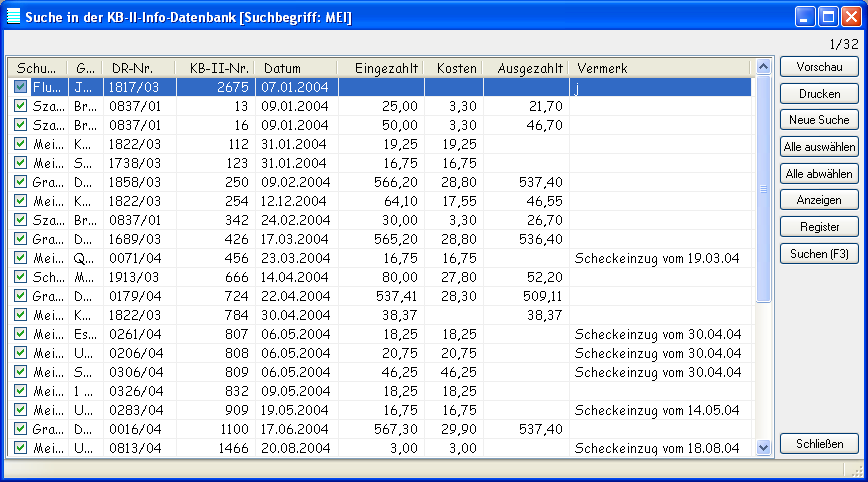 Wie Sie sehen, wird bei der Suche nach einem Schuldner auch der Gläubiger angezeigt. In der Spalte Eingezahlt werden die jeweils eingezahlten Beträge einer Buchung angezeigt, in der Spalte Kosten wird die Summe der Kosten, also Gebühren, Wegegelder, Pauschalen usw.. angezeigt. In der Spalte Ausgezahlt werden die ausgezahlten Beträge, in der Spalte Vermerke werden gespeicherte Vermerke dargestellt.
