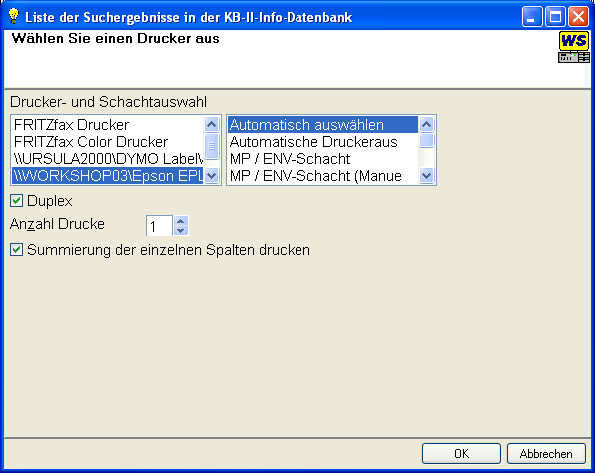 Wählen Sie hier einen Drucker und den zu verwendenden Druckerschacht aus, geben Sie an, ob der Ausdruck im Duplex-Druckverfahren (beidseitiger Ausdruck) soll und wieviele Ausdrucke Sie benötigen. Wenn eine Summierung unter dem Ausdruck erfolgen soll, versehen Sie die entsprechende Option mit einem Häkchen. Klicken Sie nun auf , wird der Ausdruck erzeugt. Bitte beachten Sie, dass nur mit einem Häkchen versehene Datensätze ausgedruckt werden!