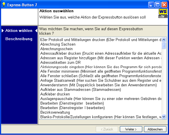 Im ersten Schritt können Sie die Aktion, welche beim Klicken des Expressbuttons ausgelöst werden soll, auswählen. Der Assistent zeigt eine Liste aller verfügbaren Programmfunktionen an.