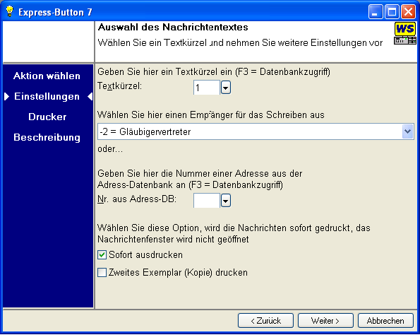 Wählen Sie anschließend einen Empfänger für das Schreiben aus, in unserem Beispiel ist es der Gläubigervertreter. Sollten Sie eine Expressfunktion benötigen, bei der eine Nachricht an eine Adresse aus der Adressdatenbank erstellt werden soll, können Sie im Feld Nr. aus Adress-DB die Nummer der gewünschten Adresse angeben (Datenbankzugriff auch hier wieder mit F3 oder Klick auf den Button mit dem Pfeil möglich). Diese Option schließt die Auswahl eines Empfängers aus der Akte aus !
