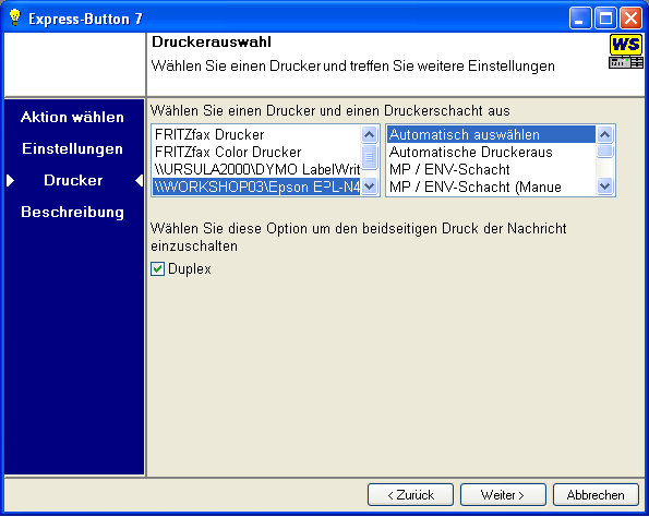Hier können Sie den Drucker bestimmen, auf dem die (in diesem Beispiel erzeugte) Nachricht ausgegeben werden soll. Versehen Sie die Checkbox Duplex mit einem Häkchen, wenn der beidseitige Druck aktiviert werden soll (nur wenn dies Ihr Drucker unterstützt, andernfalls wird diese Funktion ignoriert).