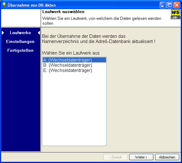 Im Ersten Schritt können Sie ein Laufwerk auswählen, in welchem sich der Übergabe-Datenträger befindet. Es werden nur Wechsellaufwerke unterstützt.