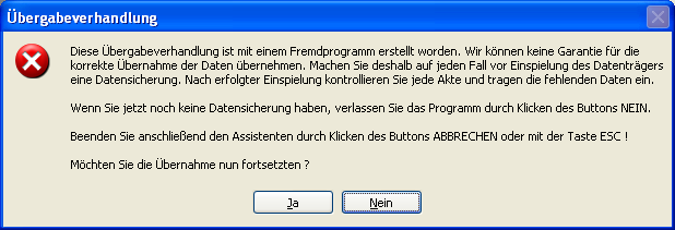 Nach dem Sie auf F10) geklickt haben, wird das ausgewählte Laufwerk überprüft, ggf. darauf enthaltene Übergabedateien werden analysiert und ausgewertet. Wenn die Übergabedateien von einem Fremdanbieter erzeugt worden sind, wird folgender Hinweis angezeigt: