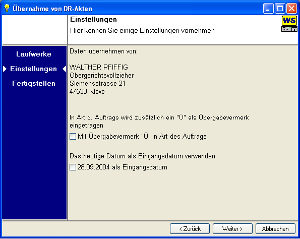 bestätigt haben, wird angezeigt, von welchem Kollegen die Daten stammen. Sie können hier außerdem festlegen, ob zusätzlich zu den in Art des Auftrags vorhandenen Informationen ein Ü eingetragen werden soll. Damit wird auch später ersichtlich, dass diese Daten von einem Kollegen übernommen worden sind. Des weiteren können Sie festlegen, ob als Eingangsdatum das heutige Datum oder aber das in den übergebenen Akten gespeicherte Datum als Eingangsdatum verwendet werden soll.Mit einem Klick auf F10) kommen Sie zur dritten Seite. Hier wird eine Zusammenfassung der Einstellungen angezeigt.