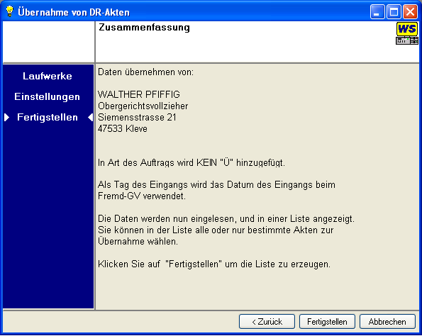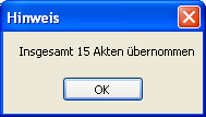 Nach dem der Übernahmevorgang abgeschlossen worden ist, wird in einer kleinen Meldung angezeigt, wieviele Akten übernommen worden sind.