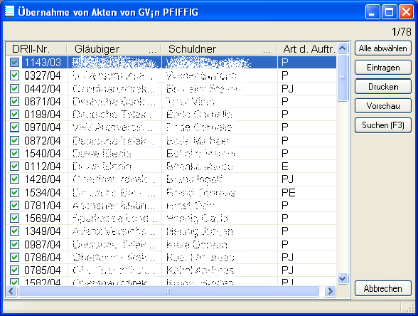 (Wenn Sie nur bestimmte Akten übernehmen wollen, entfernen Sie bei den nicht zu übernehmenden Akten das Häkchen links am Datensatz. Klicken Sie nun auf Eintragen, werden die Daten verarbeitet. Dabei werden neue Akten erzeugt, das Namenverzeichnis sowie die Adress-Datenbank werden aktualisiert. Ein kleines Fenster gibt Auskunft über die momentan verarbeitete Akte.