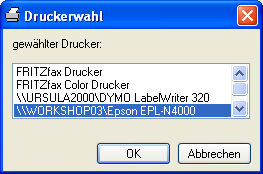 oder , können Sie sich eine Liste der zu übernehmenden Akten ausdrucken lassen. Dazu wählen Sie im folgenden Fenster den zu verwendenden Drucker aus:Bestätigen Sie die Auswahl mit