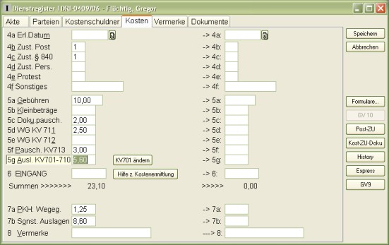 Die Kosten werden bei der Neueintragung einer DR I-Sache automatisch vom Programm ermittelt. Weitere Informationen zur Kostenermittlung finden Sie hier.