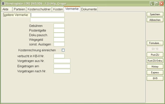 Die zweite Seite verzeichnet die Namen und Adressen der beteiligten Parteien, sowie deren Vertreter. Die dritte Seite enthält den Kostenschuldner inklusive seiner Bankverbindung. Auf der vierten Seite des DR I geben Sie das Erledigunsdatum, die Statistik und die Kostenrechnung ein. Auf der fünften Seite können Sie einige zusätzliche Vermerke machen.
