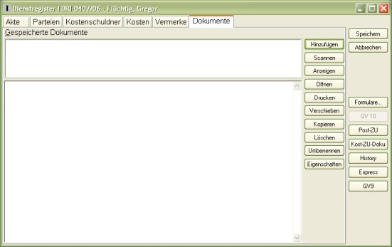 Die letzte Seite des Dienstregisters beinhaltet das Dokumentenmanagement.