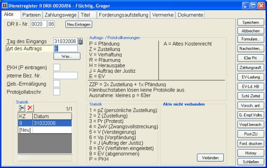 Ein alte Akte rufen Sie auf, indem Sie direkt die vorhandene DR-Nr. eingeben oder über die Buttons Register und Akte suchen nach vorhandenen Akten suchen und diese dann per Mausklick anwählen. Falls Sie ein neue Akte anlegen, geben Sie auf der ersten Seite die Art des Auftrags ein. Hier genügt es, wenn Sie die Abkürzung des Auftrags, bzw. Protokolls eintragen. Bitte achten Sie darauf die Abkürzung in Großbuchstaben einzutragen (Ausnahme: p = 63er).