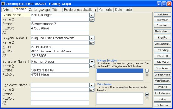 Auf dem Karteireiter Parteien können Sie die Namen und Adressen der Gläubiger, Gläubigervertreter, Schuldner und Schuldnervertreter eingeben. Diese Daten können Sie mit der Taste F3 oder per Mausklick auf den kleinen Pfeil neben dem Eingabefeld aus einer Adressdatenbank importieren oder mit der Taste F6 aus dem Register holen. Hier steht Ihnen die Funktion Suche im Register zur Verfügung.