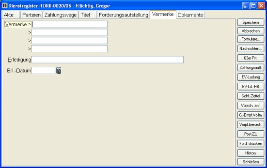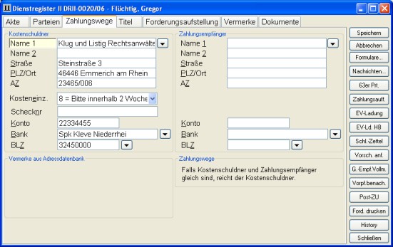 Auf Seite 3 Zahlungswege des Dienstregister II geben Sie Name und Adresse des Kostenschuldners und des Zahlungsempfängers ein. Geben Sie außerdem die Art der Zahlung, sowie die Bankverbindungen ein.