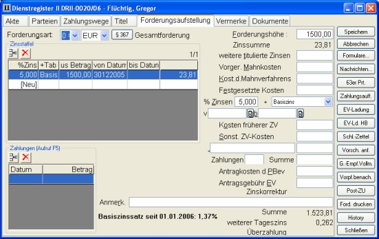 Auf der Seite 5 steht Ihnen eine Forderungsaufstellung nach §§ 366, 367 BGB zur Verfügung. Sie können hier Zinssätze angeben, die über dem Basiszinssatz oder SRF-Satz liegen (Gesetzesänderung § 104 ZPO von Oktober 2001). Es können beliebig viele Zinsläufe eingetragen werden.
