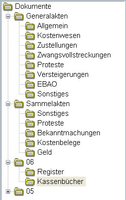 Die linke Seite des Fensters enthält die Baumstruktur der Dokumentenverwaltung. Durch einen Klick auf das Plus- bzw. das Minus-Zeichen links neben einem Ordner-Symbol kann die Struktur auf- bzw. zugeklappt werden.