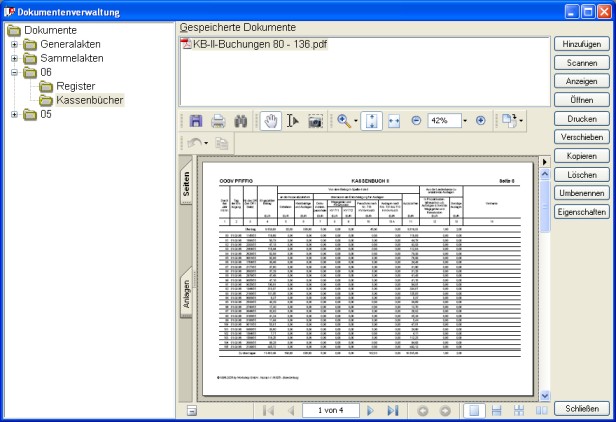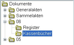 In diesem Beispiel wurde auf das Plus-Zeichen links vom Ordner 06 (welcher für das Jahr 2006 steht) geklickt. Im Ordner 06 sind noch die Ordner Register und Kassenbücher enthalten, in unserem Beispiel wurde der Ordner Kassenbücher ausgewählt. Im oberen Bereich des Dokumentenmanagements ist eine kleinere Liste enthalten, in ihr werden die gespeicherten Dokumente in diesem Ordner angezeigt:
