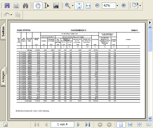 Im Beispiel sehen Sie die Kopie der gedruckten Kassenbuch II-Buchungen Nr. 80 - 136. Die Kopien der gedruckten KB-Seiten werden vom GV Büro System automatisch erzeugt und in den richtigen Ordner gespeichert. Es handelt sich hierbei um PDF-Dokumente (engl. Portable Document Format). Dieses Dateiformat kann mit dem kostenlos erhältlichen Tool Acrobat-Reader der Firma Adobe angezeigt und gedruckt werden. Sollte der Acrobat-Reader nicht auf Ihrem Computer installiert sein, finden Sie das Setup im Ordner C:\Programme\Workshop\Dokumentation\AdbeRdr70_deu_full.exe. Die im Dokumentenmanagement gespeicherten Dokumente können selbstverständlich auch im GV Büro System angezeigt werden, sie müssen das gewünschte Dokument in der Liste nur doppelt anklicken oder rechts auf den Button klicken. In dem größten Bereich des Fensters des Dokumentenmanagements wird das gewünschte Dokument angezeigt: