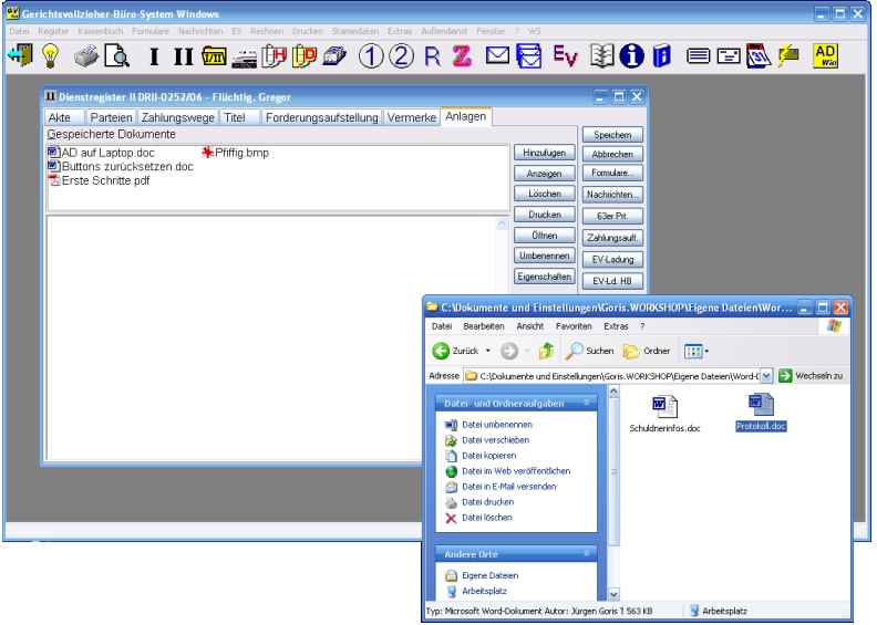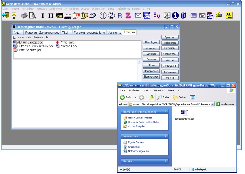 Drag & Drop bedeutet Ziehen und Ablegen, womit die Vorgehensweise eigentlich schon treffend erklärt wurde. Angenommen Sie haben den Windows-Explorer geöffnet und sehen in einem beliebigen Ordner ein Word-Dokument. Dieses Dokument ist der DR-Akte 252/06 zugeordnet. Warum also nicht in die Dokumentenverwaltung aufnehmen? Nichts ist einfacher als das, vorausgesetzt das GV Büro System ist bereits gestartet, die Akte 252/06 ist geöffnet und die Registerkarte Anlagen ist aktiv: