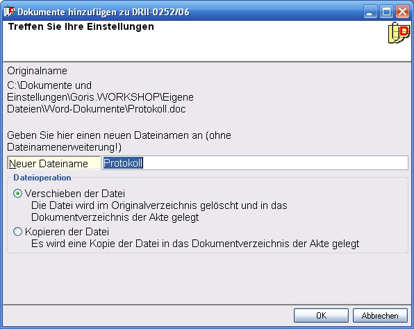 Hier können Sie nun entscheiden, ob das gewählte Dokument in die Dokumentenverwaltung verschoben werden soll, oder ob eine Kopie dort angelegt wird. Des weiteren können Sie dem Dokument hier einen neuen Namen geben. Bitte beachten Sie, dass Sie die Dateinamenerweiterung (in diesem Beispiel ".DOC") NICHT angeben dürfen, sie wird vom Originaldateinamen übernommen! Klicken Sie auf den Button
